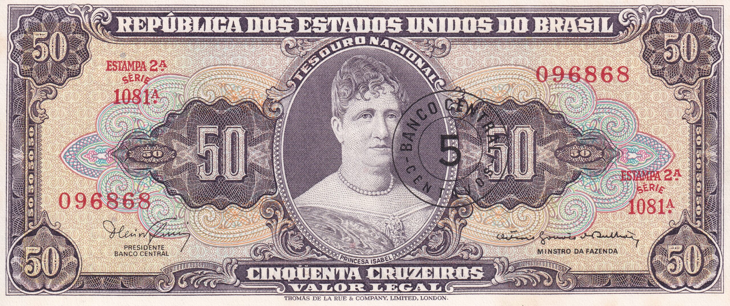 CÉDULA 5 CENTAVOS c/c em 50 CRUZEIROS 1966 – BANCO CENTRAL DO BRASIL – 2ª Estampa (TLR) – FE