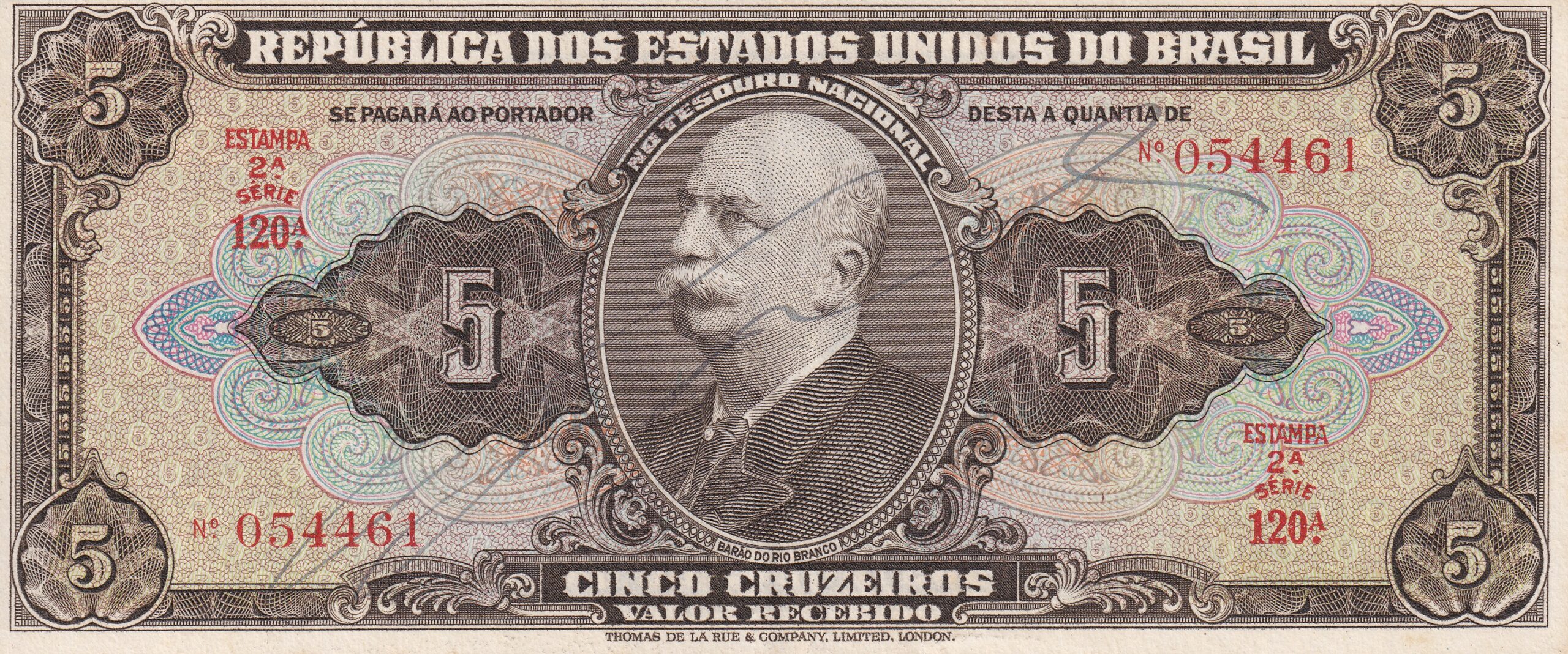 CÉDULA 5 CRUZEIROS 1950 – TESOURO NACIONAL – 2ª Estampa (TLR) – Soberba