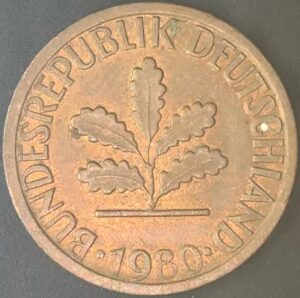 KM#105F – ALEMANHA 1 PFENNIG 1980 “letra F” MBC
