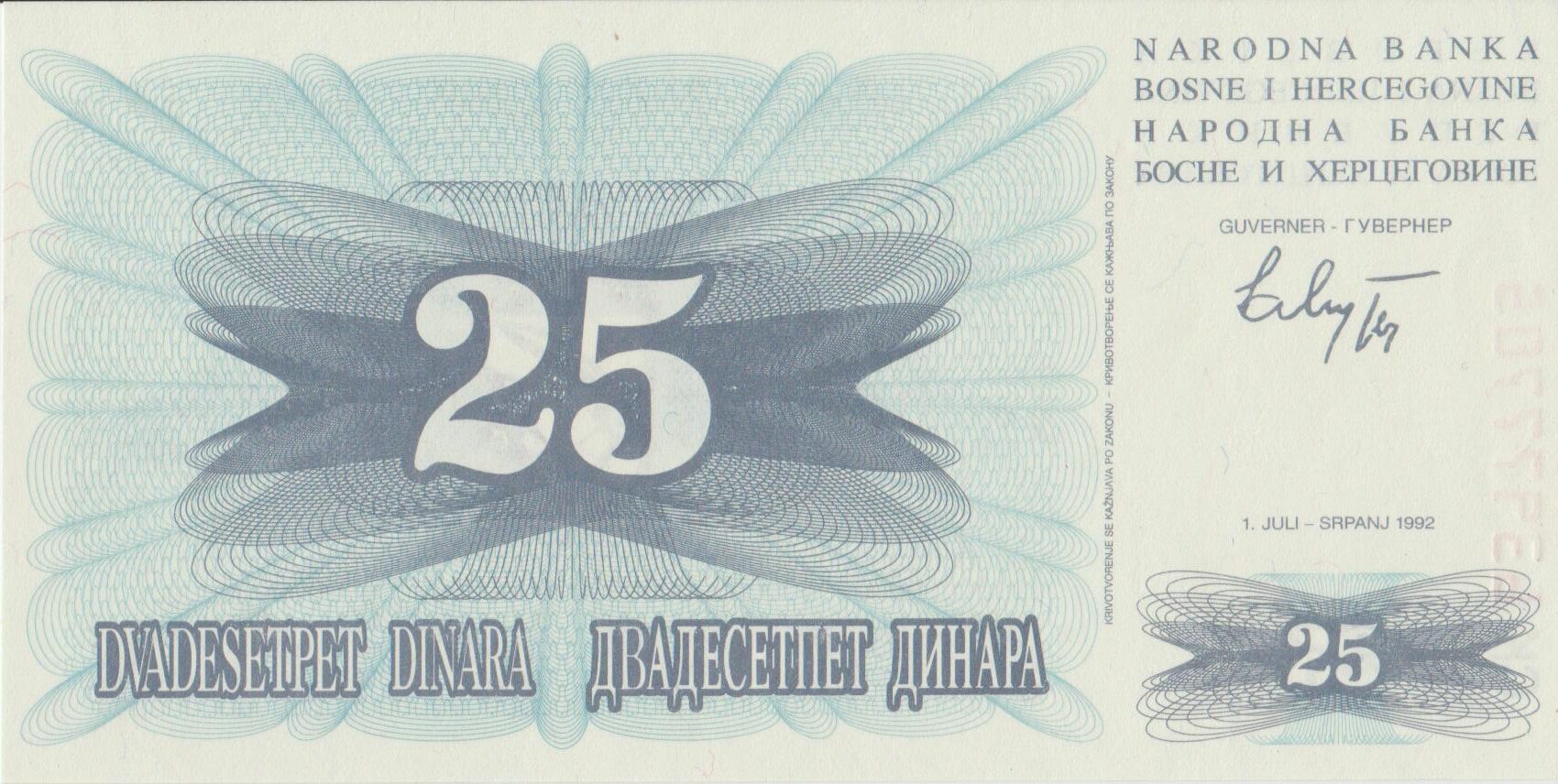 P 11 – Bósnia e Herzegovina – 25 Dinara – 1992 – FE